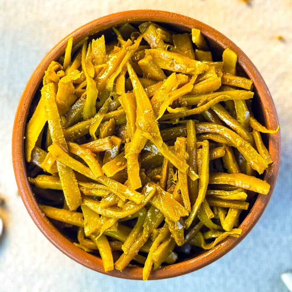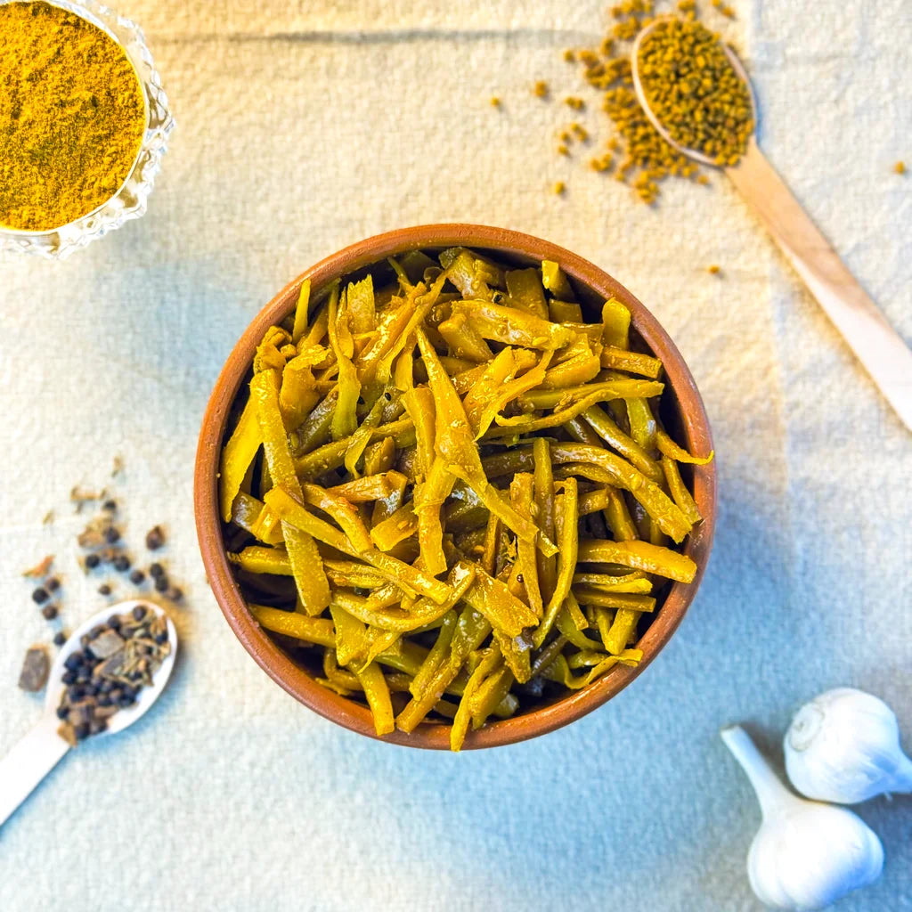 Discover the power of tradition and health with our Moringa Pickle, made from fresh moringa (sohanjna) pods sourced from local farms. Each piece is carefully cleaned, cut, and marinated in pure mustard oil with a signature Shikarpuri spice blend, giving it a rich, earthy, and tangy taste that stands out from regular pickles.